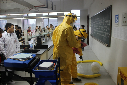 随后,与会人员在大化实验教学中心观摩了危险化学品泄漏应急演练。演练以实验室常见易发的危险化学品泄漏事故为案例,现场模拟了实验中酸性废液大面积泼洒事故发生后,受伤人员的抢救与组织撤离、现场封锁及事故危害评估、事故的上报程序、应急救援人员的个人防护、消除危险源与现场恢复、事故发生后的调查与评估等应急救援环节。这是我校首次进行针对危险化学品泄露事故的应急处置演练。