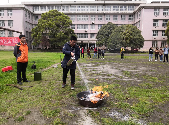 首先,李老师宣布消防安全演练正式开始,张政教官向在场的师生讲解了干粉灭火器与水基灭火器的正确使用方法、灭火步骤和灭火姿势以及在火灾中的逃生方法等。随后,张政教官现场示范了灭火器的使用,并向两个燃烧盆浇上汽油,点起了熊熊烈火,在场的师生感到一股热浪随风袭来,形象地感受到了火灾发生时的场景。在张政教官的指导下,同学们依次拿起灭火器,按正确的使用方法和灭火步骤进行了灭火的实际操作,整个过程同学们严肃认真,服从指挥,火焰被一次次扑灭,教官又一次次重新点燃火盆。